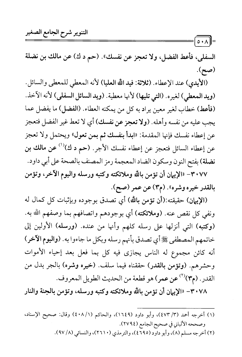 3077 - "الإيمان أن تؤمن بالله وملائكته وكتبه ورسله واليوم الآخر، وتؤمن بالقدر خيره وشره". (م 3) عن عمر (صح).