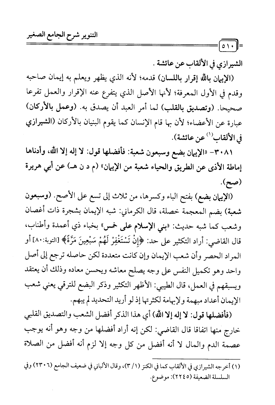 3081 - "الإيمان بضع وسبعون شعبة: فأفضلها قول: لا إله إلا الله، وأدناها إماطة الأذى عن الطريق والحياء شعبة من الإيمان" (م د ن هـ) عن أبي هريرة (صح).