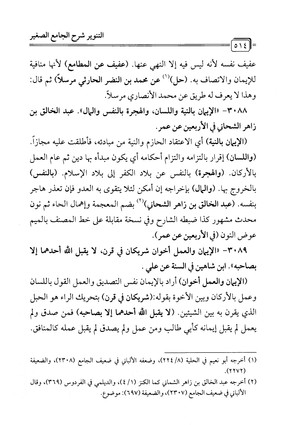 3089 - "الإيمان والعمل أخوان شريكان في قرن، لا يقبل الله أحدهما إلا بصاحبه ". ابن شاهين في السنة عن علي.