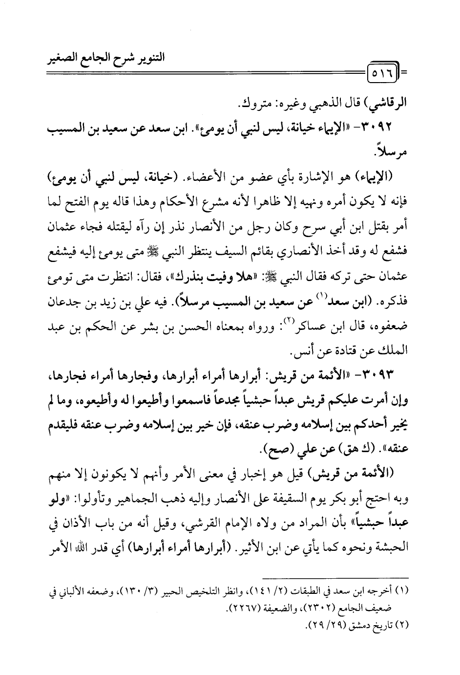 3092 - "الإيماء خيانة, ليس لنبي أن يومئ". ابن سعد عن سعيد بن المسيب مرسلاً.
