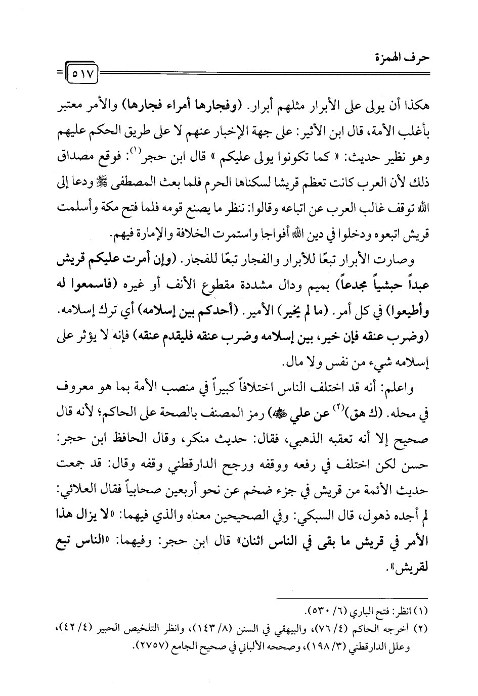 هكذا أن يولى على الأبرار مثلهم أبرار. (وفجارها أمراء فجارها) والأمر معتبر بأغلب الأمة، قال ابن الأثير: على جهة الإخبار عنهم لا على طريق الحكم عليهم وهو نظير حديث: "كما تكونوا يولى عليكم" قال ابن حجر (¬1): فوقع مصداق ذلك لأن العرب كانت تعظم قريشاً لسكناها الحرم فلما بعث المصطفى - صلى الله عليه وسلم - ودعا إلى الله توقف غالب العرب عن اتباعه وقالوا: ننظر ما يصنع قومه فلما فتح مكة وأسلمت قريش اتبعوه ودخلوا في دين الله أفواجاً واستمرت الخلافة والإمارة فيهم.