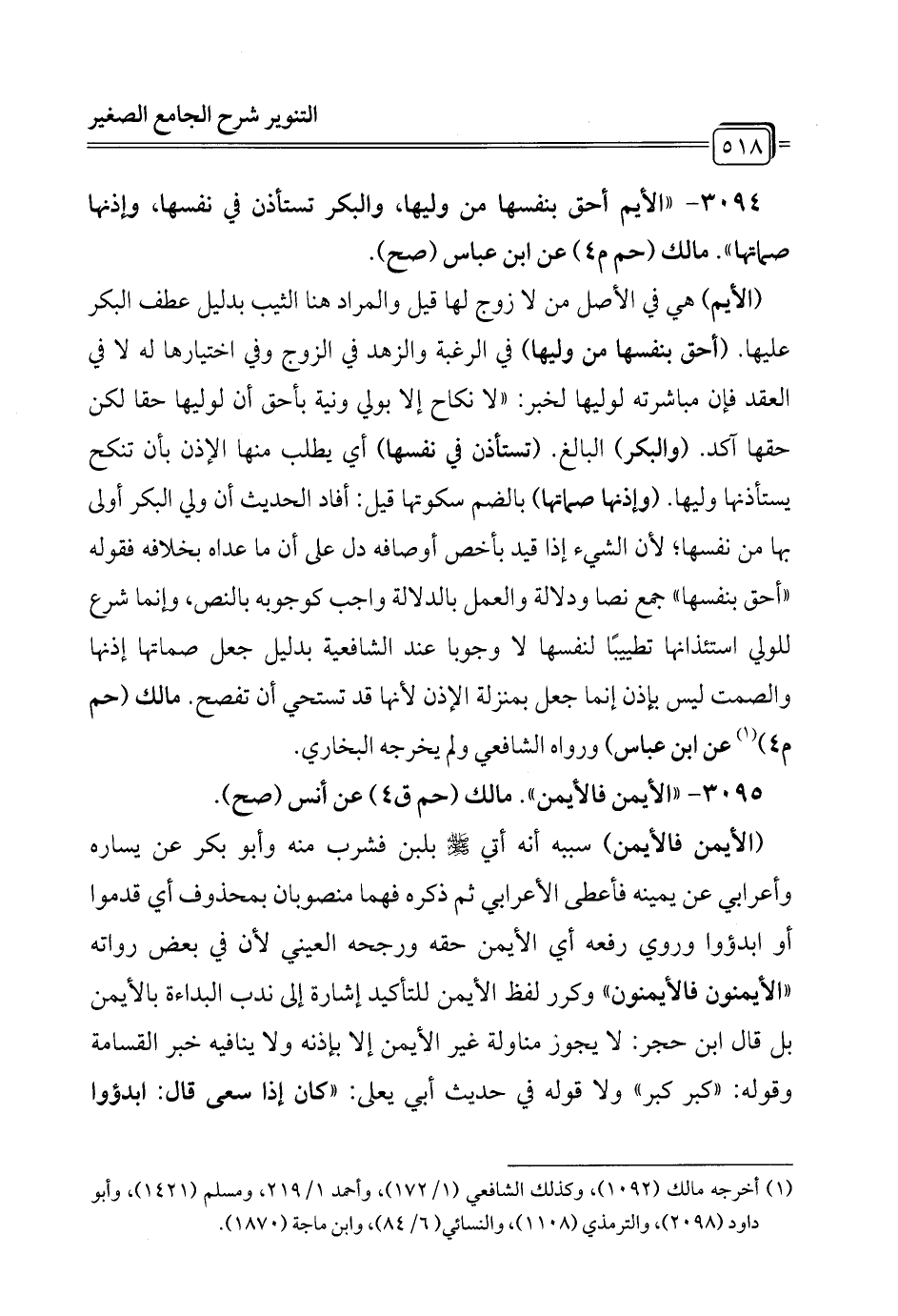 3094 - "الأيم أحق بنفسها من وليها، والبكر تستأذن في نفسها، وإذنها صماتها". مالك (حم م 4) عن ابن عباس (صح).