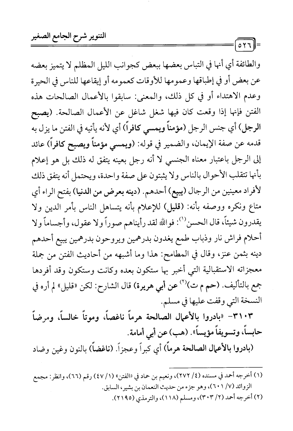 والطائفة أي أنها في التباس بعضها ببعض كجوانب الليل المظلم لا يتميز بعضه عن بعض أو في إطباقها وعمومها للأوقات كعمومه أو إيقاعها للناس في الحيرة وعدم الاهتداء أو في كل ذلك، والمعنى: سابقوا بالأعمال الصالحات هذه الفتن فإنها إذا وقعت كان فيها شغل شاغل عن الأعمال الصالحة. (يصبح الرجل) أي جنس الرجل (مؤمناً ويمسي كافراً) أي لأنه يأتيه في الفتن ما يزل به قدمه عن صفة الإيمان، والضمير في قوله: (ويمسي مؤمناً ويصبح كافراً) عائد إلى الرجل باعتبار معناه الجنسي لا أنه رجل بعينه يتفق له ذلك بل هو إعلام بأنها تتقلب الأحوال بالناس ولا يثبتون على صفة واحدة، ويحتمل أنه يتفق ذلك لأفراد معينين من الرجال (يبيع) أحدهم. (دينه بعرض من الدنيا) بفتح الراء أي متاع ونكره ووصفه بأنه: (قليل) للإعلام بأنه يتساهل الناس بأمر الدين ولا يقدرون شيئاً، قال الحسن (¬1): فوالله لقد رأيناهم صوراً ولا عقول، وأجساماً ولا أحلام فراش نار وذباب طمع يغدون بدرهمين ويروحون بدرهمين يبيع أحدهم دينه بثمن عنز، وقال في المطامح: هذا وما أشبهه من أحاديث الفتن من جملة معجزاته الاستقبالية التي أخبر بها ستكون بعده وكانت وستكون وقد أفردها جمع بالتأليف. (حم م ت) (¬2) عن أبي هريرة) قال الشارح: لكن "قليل" لم أره في النسخة التي وقفت عليها في مسلم.