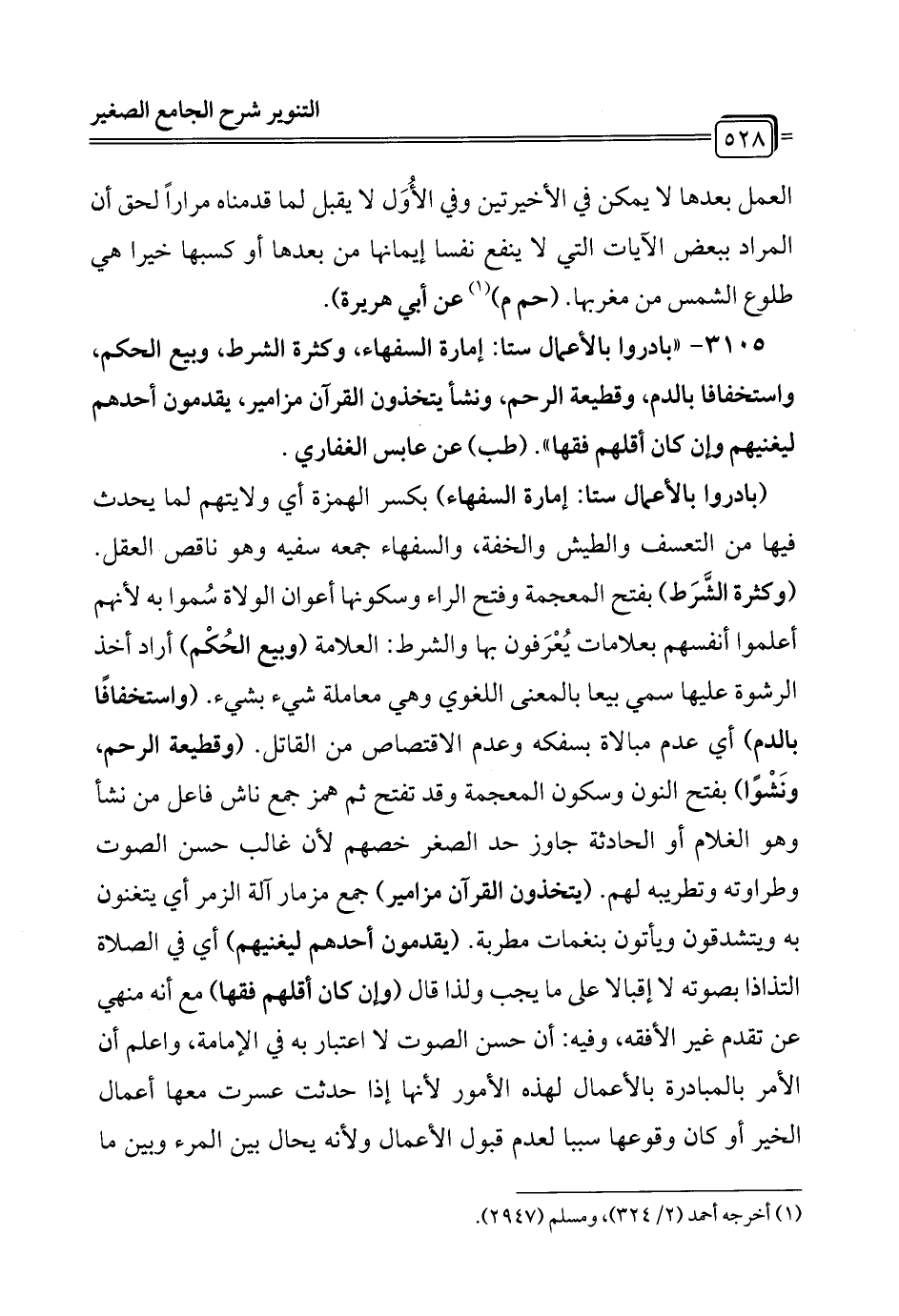 (بادروا بالأعمال ستاً: إمارة السفهاء) بكسر الهمزة أي ولا يتهم لما يحدث فيها من التعسف والطيش والخفة، والسفهاء جمعه سفيه وهو ناقص العقل. (وكثرة الشَّرَط) بفتح المعجمة وفتح الراء وسكونها أعوان الولاة سُموا به لأنهم أعلموا أنفسهم بعلامات يُعْرَفون بها والشرط: العلامة (وبيع الحُكْم) أراد أخذ الرشوة عليها سمي بيعاً بالمعنى اللغوي وهي معاملة شيء بشيء. (واستخفافًا بالدم) أي عدم مبالاة بسفكه وعدم الاقتصاص من القاتل. (وقطيعة الرحم، ونَشْواً) بفتح النون وسكون المعجمة وقد تفتح ثم همز جمع ناش فاعل من نشأ وهو الغلام أو الحادثة جاوز حد الصغر خصهم لأن غالب حسن الصوت وطراوته وتطريبه لهم. (يتخذون القرآن مزامير) جمع مزمار آلة الزمر أي يتغنون به ويتشدقون ويأتون بنغمات مطربة. (يقدمون أحدهم ليغنيهم) أي في الصلاة التذاذا بصوته لا إقبالاً على ما يجب ولذا قال (وإن كان أقلهم فقهاً) مع أنه منهي عن تقدم غير الأفقه، وفيه: أن حسن الصوت لا اعتبار به في الإمامة، واعلم أن الأمر بالمبادرة بالأعمال لهذه الأمور لأنها إذا حدثت عسرت معها أعمال الخير أو كان وقوعها سبباً لعدم قبول الأعمال ولأنه يحال بين المرء وبين ما