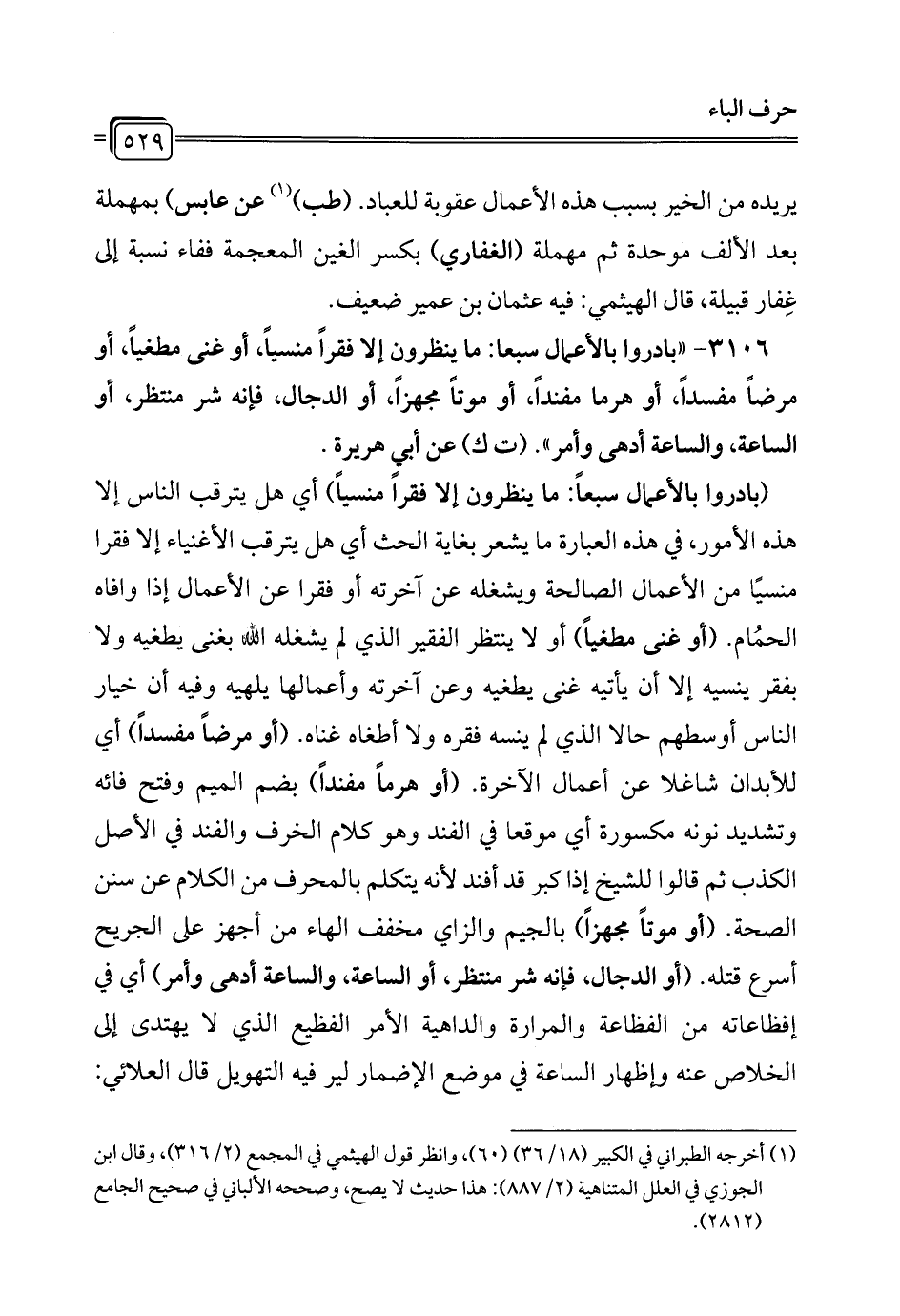 3106 - "بادروا بالأعمال سبعاً: ما ينظرون إلا فقراً منسياً، أو غنى مطغياً، أو مرضاً مفسداً، أو هرماً مفنداً، أو موتاً مجهزاً، أو الدجال، فإنه شر منتظر، أو الساعة والساعة أدهى وأمر". (ت ك) عن أبي هريرة.