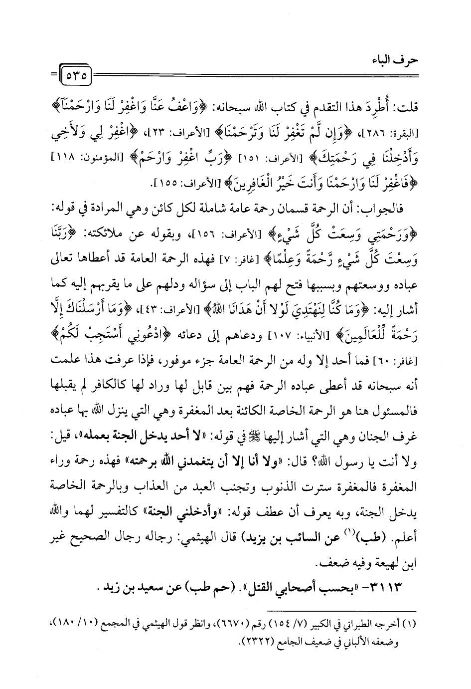 فالجواب: أن الرحمة قسمان رحمة عامة شاملة لكل كائن وهي المرادة في قوله: {وَرَحْمَتِي وَسِعَتْ كُلَّ شَيْءٍ} [الأعراف: 156]، وبقوله عن ملائكته: {رَبَّنَا وَسِعْتَ كُلَّ شَيْءٍ رحْمَةً وَعِلْمًا} {غافر: 7] فهذه الرحمة العامة قد أعطاها تعالى عباده ووسعتهم وبسببها فتح لهم الباب إلى سؤاله ودلهم على ما يقربهم إليه كما أشار إليه: {وَمَا كُنَّا لِنَهْتَدِيَ لَوْلا أَنْ هَدَانَا اللهُ} [الأعراف: 43]، {وَمَا أَرْسَلْنَاكَ إِلَّا رَحْمَةً لِّلْعَالَمِينَ} [الأنبياء: 107] ودعاهم إلى دعائه {ادْعُونِي أَسْتَجِبْ لَكُمْ} [غافر: 60] فما أحد إلا وله من الرحمة العامة جزء موفور، فإذا عرفت هذا علمت أنه سبحانه قد أعطى عباده الرحمة فهم بين قابل لها وراد لها كالكافر لم يقبلها فالمسئول هنا هو الرحمة الخاصة الكائنة بعد المغفرة وهي التي ينزل الله بها عباده غرف الجنان وهي التي أشار إليها في قوله: "لا أحد يدخل الجنة بعمله"، قيل: ولا أنت يا رسول الله؟ قال: "ولا أنا إلا أن يتغمدني الله برحمته" فهذه رحمة وراء المغفرة فالمغفرة سترت الذنوب وتجنب العبد من العذاب وبالرحمة الخاصة يدخل الجنة، وبه يعرف أن عطف قوله: "وأدخلني الجنة" كالتفسير لهما والله أعلم. (طب) (¬1) عن السائب بن يزيد) قال الهيثمي: رجاله رجال الصحيح غير ابن لهيعة وفيه ضعف.