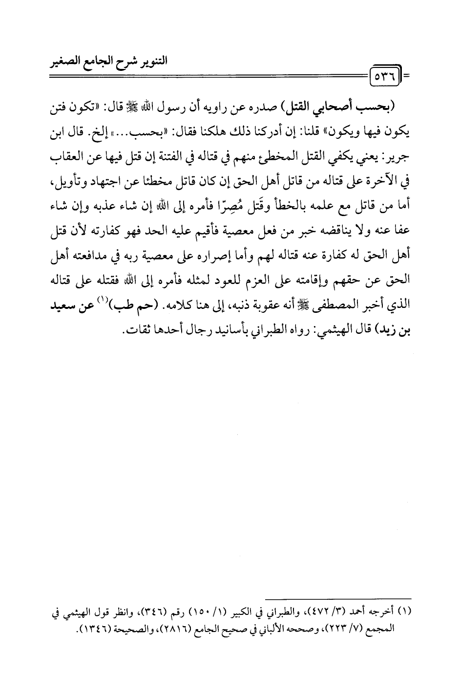 (بحسب أصحابي القتل) صدره عن راويه أن رسول الله - صلى الله عليه وسلم - قال: "تكون فتن يكون فيها ويكون" قلنا: إن أدركنا ذلك هلكنا فقال: "بحسب ... " إلخ. قال ابن جرير: يعني يكفي القتل المخطئ منهم في قتاله في الفتنة إن قتل فيها عن العقاب في الآخرة على قتاله من قاتل أهل الحق إن كان قاتل مخطئاً عن اجتهاد وتأويل، أما من قاتل مع علمه بالخطأ وقَتل مُصِرّا فأمره إلى الله إن شاء عذبه وإن شاء عفا عنه ولا يناقضه خبر من فعل معصية فأقيم عليه الحد فهو كفارته لأن قتل أهل الحق له كفارة عنه قتاله لهم وأما إصراره على معصية ربه في مدافعته أهل الحق عن حقهم وإقامته على العزم للعود لمثله فأمره إلى الله فقتله على قتاله الذي أخبر المصطفى - صلى الله عليه وسلم - أنه عقوبة ذنبه، إلى هنا كلامه. (حم طب) (¬1) عن سعيد بن زيد) قال الهيثمي: رواه الطبراني بأسانيد رجال أحدها ثقات.