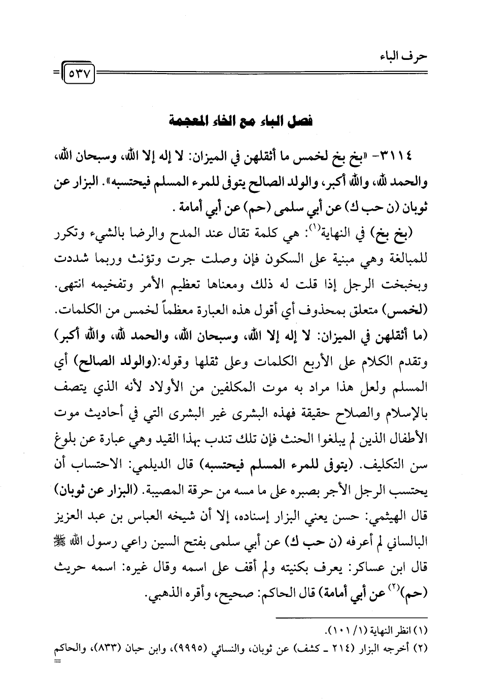 3114 - " بخ بخ لخمس ما أثقلهن في الميزان: لا إله إلا الله، وسبحان الله، والحمد لله، والله أكبر، والولد الصالح يتوفى للمرء المسلم فيحتسبه". البزار عن ثوبان (ن حب ك) عن أبي سلمى (حم) عن أبي أمامة.