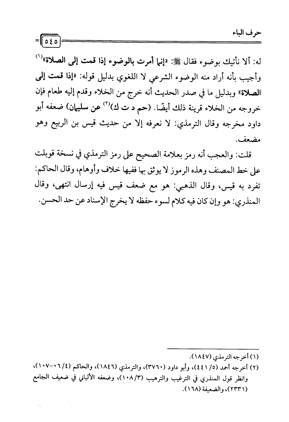 قلت: والعجب أنه رمز بعلامة الصحيح على رمز الترمذي في نسخة قوبلت على خط المصنف وهذه الرموز لا يوثق بها ففيها خلاف وأوهام، وقال الحاكم: تفرد به قيس، وقال الذهبي: هو مع ضعف قيس فيه إرسال انتهى، وقال المنذري: هو وإن كان فيه كلام لسوء حفظه لا يخرج الإسناد عن حد الحسن.