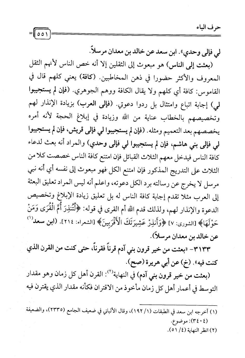 (بعثت إلى الناس) هو مبعوث إلى الثقلين إلا أنه خص الناس لأنهم الثقل المعروف والأكثر حضوراً في ذهن المخاطبين. (كافة) يعني كلهم قال في القاموس: كافة أي كلهم ولا يقال الكافة ووهم الجوهري. (فإن لم يستجيبوا لي) إجابة اتباع وامتثال بل ردوا دعوتي. (فإلى العرب) بزيادة الإنذار لهم وتخصيصهم بالخطاب عناية من الله وزيادة في إبلاغَ الحجة لأنه أمره يخصصهم بعد التعميم ومثله. (فإن لم يستجيبوا لي فإلى قريش، فإن لم يستجيبوا لي فإلى بني هاشم، فإن لم يستجيبوا لي فإلى وحدي) والمراد أنه بعث لدعاء كافة الناس فيدخل معهم الثلاث القبائل فإن امتنع كافة الناس خصصت كلا من الثلاث على التدريج المذكور فإن امتنع الكل فهو مبعوث إلى نفسه أي أنه نبي مرسل لا يخرج عن رسالته برد الكل دعوته، واعلم أنه ليس المراد تعليق البعثة إلى العرب مثلا تقدم إجابة كافة الناس له بل تعليق زيادة الإبلاع وتخصيص الدعوة والإنذار لهم، ولذلك قدم الله أم القرى في قوله: {لِتُنْذِرَ أُمَّ الْقُرَى وَمَنْ حَوْلَهَا} [الشورى: 7] {وَأَنذِرْ عَشِيرَتَكَ الْأَقْرَبِينَ} [الشعراء: 214]. (ابن سعد (¬1) عن خالد بن معدان مرسلاً).