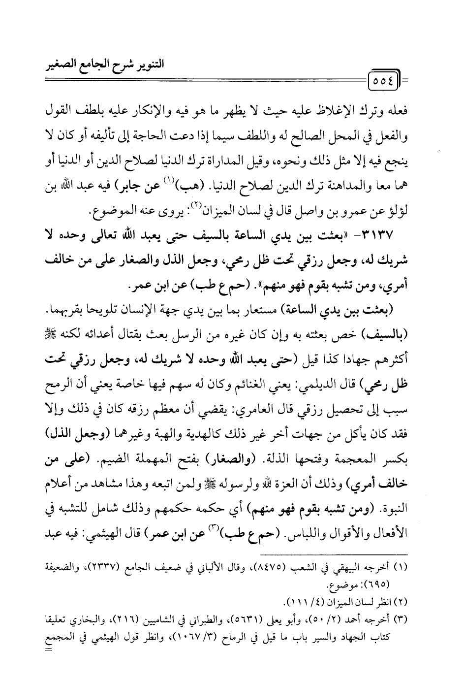 (بعثت بين يدي الساعة) مستعار بما بين يدي جهة الإنسان تلويحاً بقربهما. (بالسيف) خص بعثته به وإن كان غيره من الرسل بعث بقتال أعدائه لكنه - صلى الله عليه وسلم أكثرهم جهاداً كذا قيل (حتى يعبد الله وحده لا شريك له، وجعل رزقي تحت ظل رمحي) قال الديلمي: يعني الغنائم وكان له سهم فيها خاصة يعني أن الرمح سبب إلى تحصيل رزقي قال العامري: يقضي أن معظم رزقه كان في ذلك وإلا فقد كان يأكل من جهات أخر غير ذلك كالهدية والهبة وغيرهما (وجعل الذل) بكسر المعجمة وفتحها الذلة. (والصغار) بفتح المهملة الضيم. (على من خالف أمري) وذلك أن العزة لله ولرسوله - صلى الله عليه وسلم - ولمن اتبعه وهذا مشاهد من أعلام النبوة. (ومن تشبه بقوم فهو منهم) أي حكمه حكمهم وذلك شامل للتشبه في الأفعال والأقوال واللباس. (حم ع طب) (¬3) عن ابن عمر) قال الهيثمي: فيه عبد