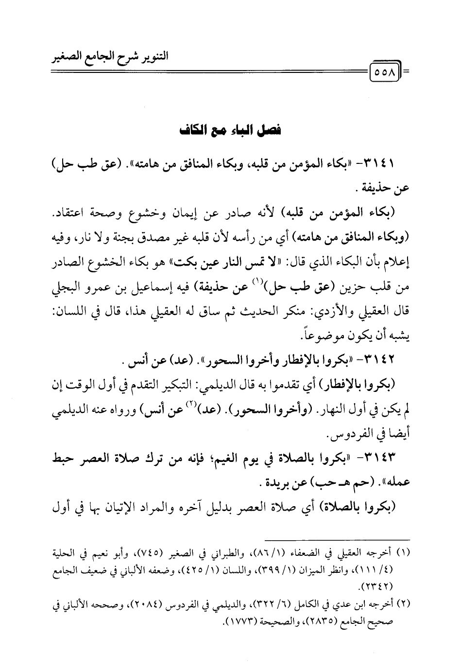 3141 - " بكاء المؤمن من قلبه, وبكاء المنافق من هامته". (عق طب حل) عن حذيفة.