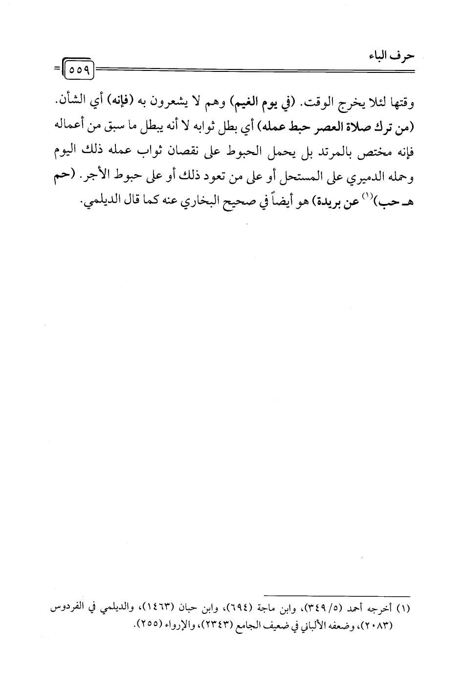 وقتها لئلا يخرج الوقت. (في يوم الغيم) وهم لا يشعرون به (فإنه) أي الشأن. (من ترك صلاة العصر حبط عمله) أي بطل ثوابه لا أنه يبطل ما سبق من أعماله فإنه مختص بالمرتد بل يحمل الحبوط على نقصان ثواب عمله ذلك اليوم وحمله الدميري على المستحل أو على من تعود ذلك أو على حبوط الأجر. (حم هـ حب) (¬1) عن بريدة) هو أيضاً في صحيح البخاري عنه كما قال الديلمي.