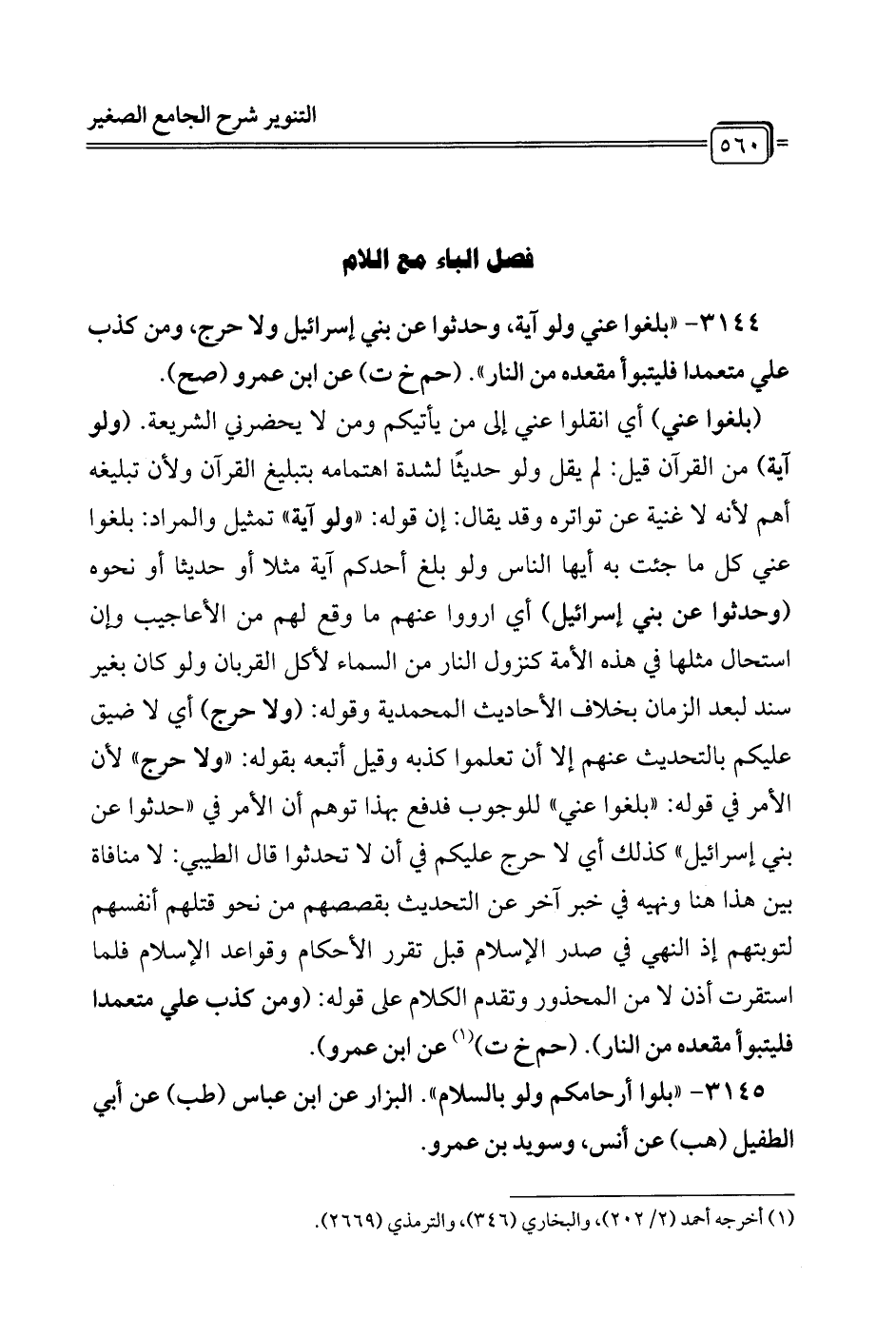 3144 - " بلغوا عني ولو آية، وحدثوا عن بني إسرائيل ولا حرج، ومن كذب علي متعمداً فليتبوأ مقعده من النار". (حم خ ت) عن ابن عمرو (صح).