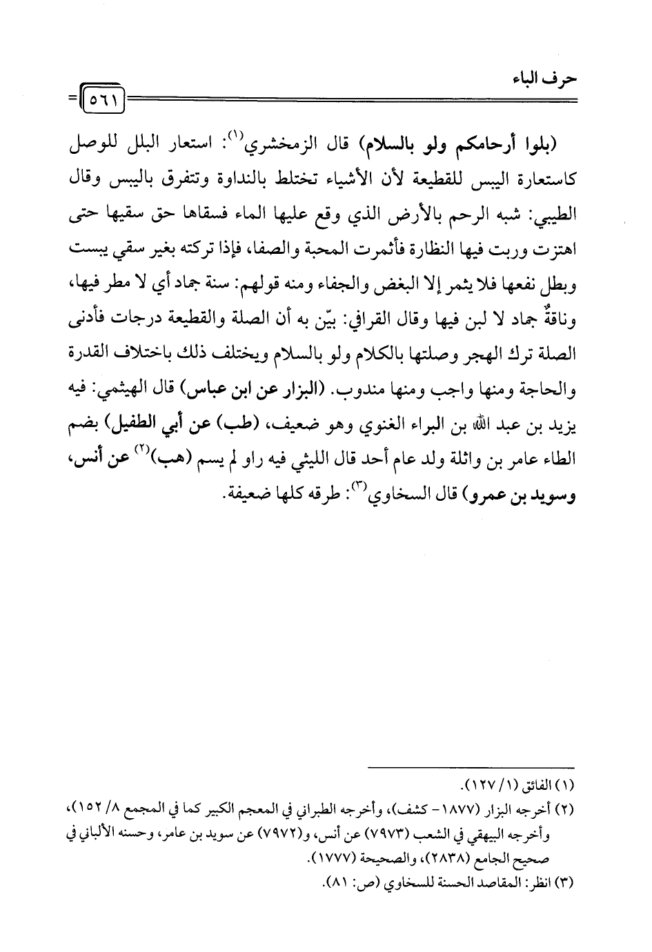 (بلوا أرحامكم ولو بالسلام) قال الزمخشري (¬1): استعار البلل للوصل كاستعارة اليبس للقطيعة لأن الأشياء تختلط بالنداوة وتتفرق باليبس وقال الطيبي: شبه الرحم بالأرض الذي وقع عليها الماء فسقاها حق سقيها حتى اهتزت وربت فيها النظارة فأثمرت المحبة والصفا، فإذا تركته بغير سقي يبست وبطل نفعها فلا يثمر إلا البغض والجفاء ومنه قولهم: سنة جماد أي لا مطر فيها، وناقةٌ جماد لا لبن فيها وقال القرافي: بيّن به أن الصلة والقطيعة درجات فأدنى الصلة ترك الهجر وصلتها بالكلام ولو بالسلام ويختلف ذلك باختلاف القدرة والحاجة ومنها واجب ومنها مندوب. (البزار عن ابن عباس) قال الهيثمي: فيه يزيد بن عبد الله بن البراء الغنوي وهو ضعيف، (طب) عن أبي الطفيل) بضم الطاء عامر بن واثلة ولد عام أحد قال الليثي فيه راو لم يسم (هب) (¬2) عن أنس، وسويد بن عمرو) قال السخاوي (¬3): طرقه كلها ضعيفة.