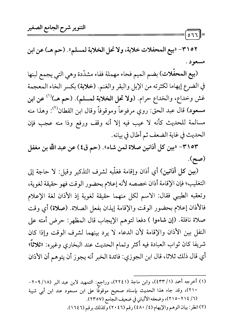 3153 - "بين كل أذانين صلاة لمن شاء". (حم ق 4) عن عبد الله بن مغفل (صح).