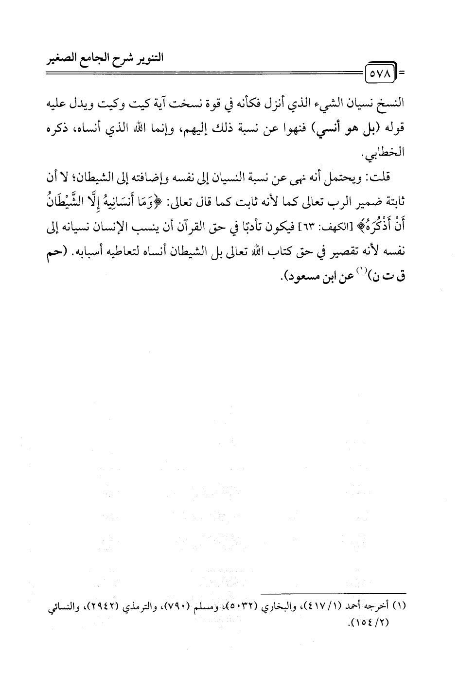 قلت: ويحتمل أنه نهى عن نسبة النسيان إلى نفسه وإضافته إلى الشيطان؛ لا أن ثابتة ضمير الرب تعالى كما لأنه ثابت كما قال تعالى: (وَمَا أَنسَانِيهُ إِلَّا الشَّيْطَانُ أَنْ أَذْكُرَهُ} [الكهف: 63] فيكون تأدبًا في حق القرآن أن ينسب الإنسان نسيانه إلى نفسه لأنه تقصير في حق كتاب الله تعالى بل الشيطان أنساه لتعاطيه أسبابه. (حم ق ت ن) (¬1) عن ابن مسعود).