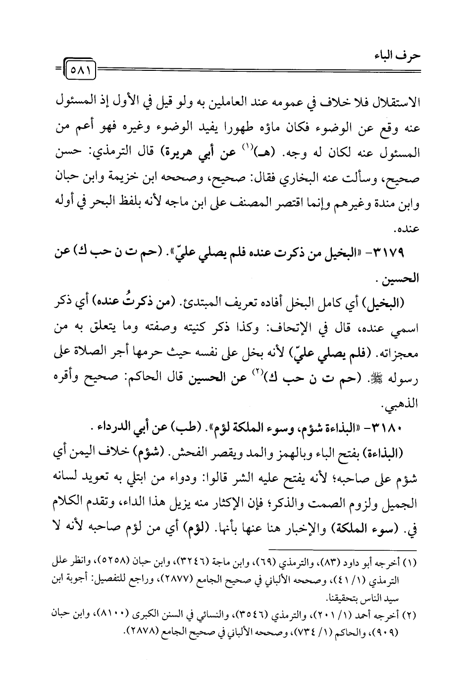 (البخيل) أي كامل البخل أفاده تعريف المبتدئ. (من ذكرتُ عنده) أي ذكر اسمي عنده، قال في الإتحاف: وكذا ذكر كنيته وصفته وما يتعلق به من معجزاته. (فلم يصلي عليّ) لأنه بخل على نفسه حيث حرمها أجر الصلاة على رسوله - صلى الله عليه وسلم -. (حم ت ن حب ك) (¬2) عن الحسين قال الحاكم: صحيح وأقره الذهبي.