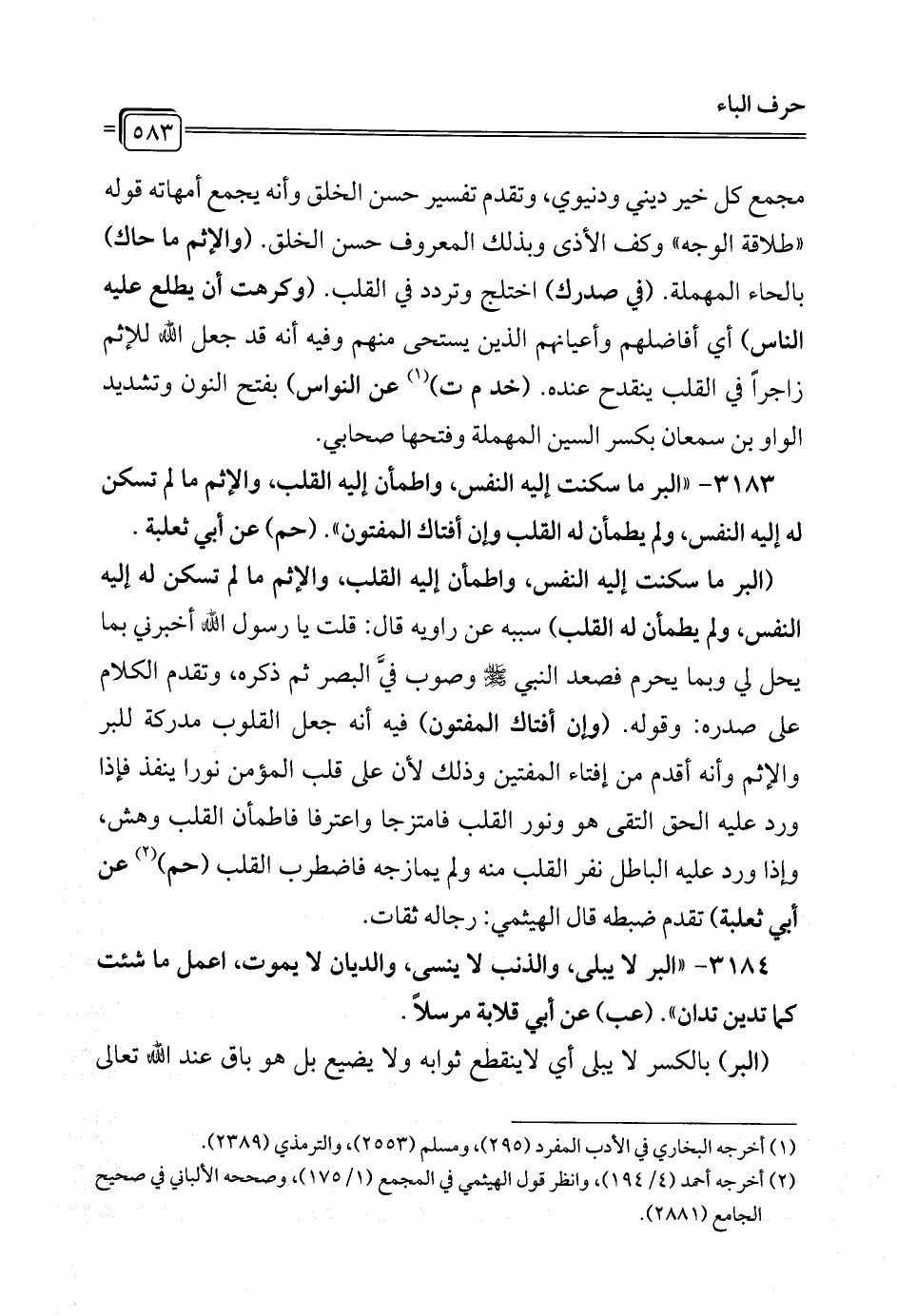 3183 - "البر ما سكنت إليه النفس، واطمأن إليه القلب، والإثم ما لم تسكن له إليه النفس، ولم يطمأن له القلب وإن أفتاك المفتون". (حم) عن أبي ثعلبة.