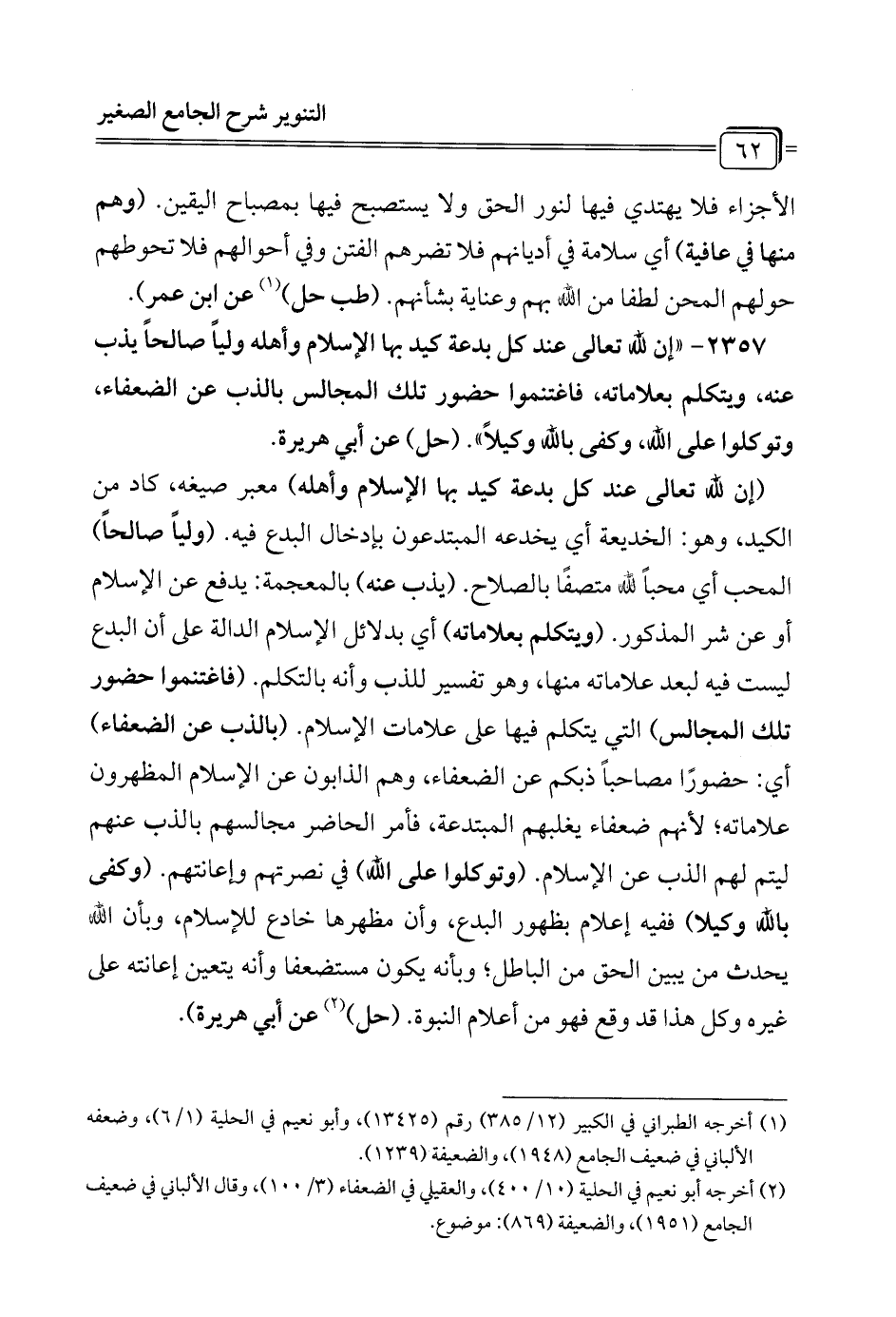 2357 - "إن لله تعالى عند كل بدعة كيد بها الإِسلام وأهله وليًا صالحًا يذب عنه، ويتكلم بعلاماته، فاغتنموا حضور تلك المجالس بالذب عن الضعفاء، وتوكلوا على الله، وكفى بالله وكيلاً". (حل) عن أبي هريرة.