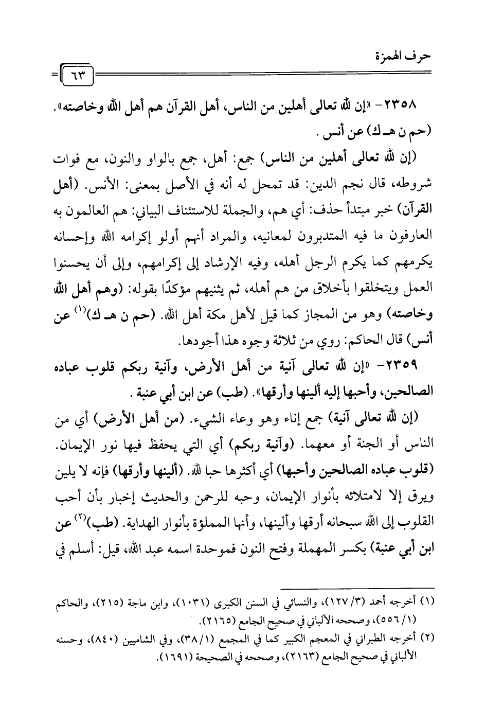 2358 - "إن لله تعالى أهلين من الناس، أهل القرآن هم أهل الله وخاصته". (حم ن هـ ك) عن أنس.