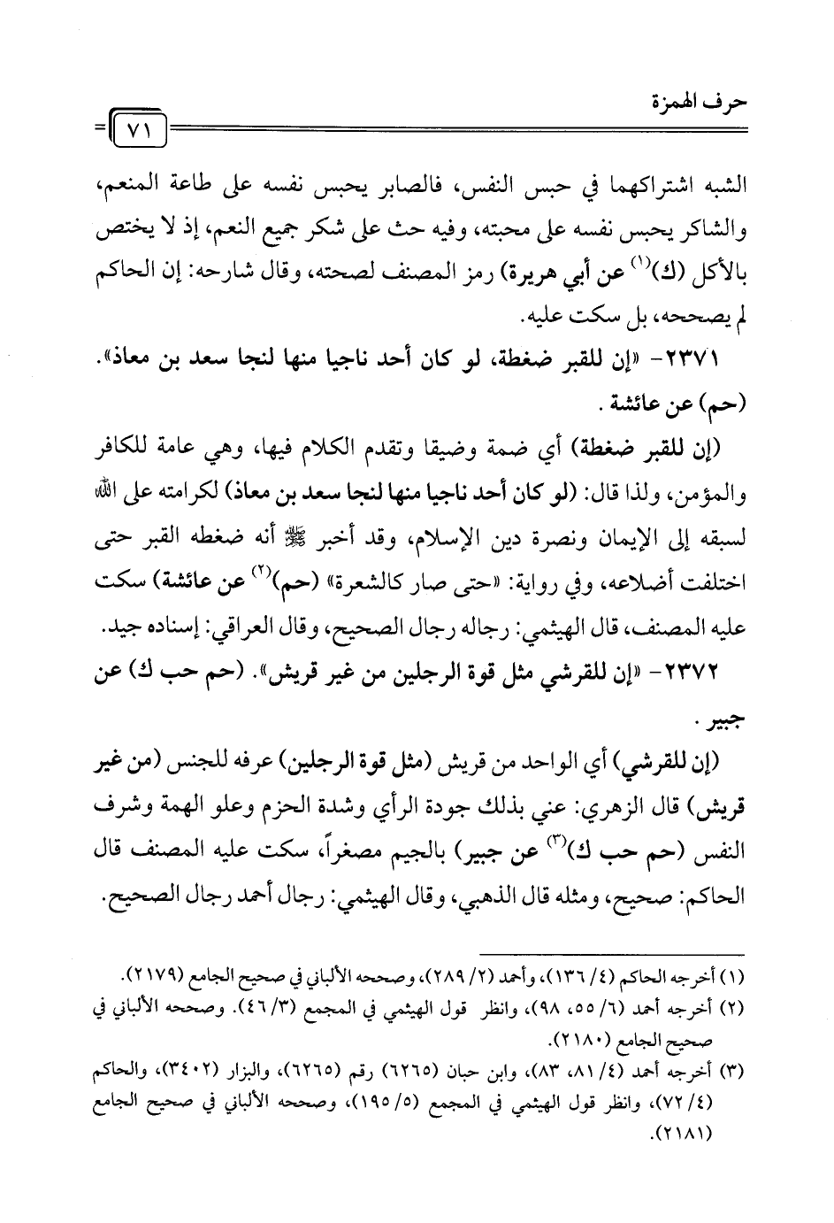 2371 - "إن للقبر ضغطة، لو كان أحد ناجيا منها لنجا سعد بن معاذ". (حم) عن عائشة.