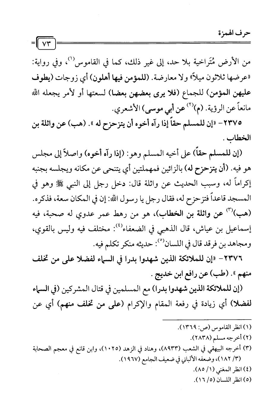 2375 - "إن للمسلم حقاً إذا رآه أخوه أن يتزحزح له". (هب) عن واثلة بن الخطاب.