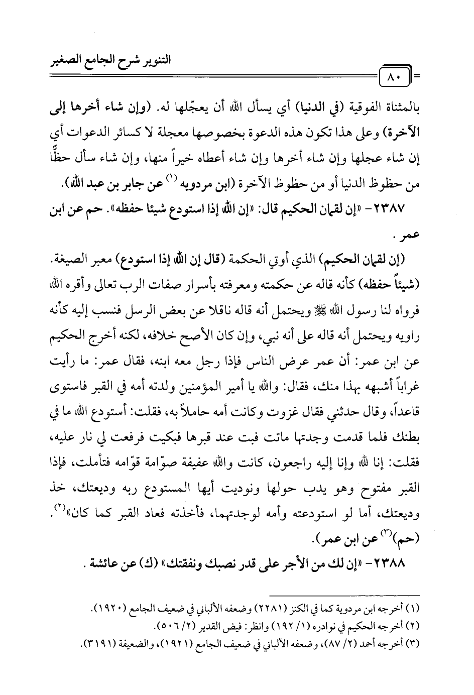 (إن لقمان الحكيم) الذي أوتي الحكمة (قال إن الله إذا استودع) معبر الصيغة. (شيئاً حفظه) كأنه قاله عن حكمته ومعرفته بأسرار صفات الرب تعالى وأقره الله فرواه لنا رسول الله - صلى الله عليه وسلم - ويحتمل أنه قاله ناقلا عن بعض الرسل فنسب إليه كأنه راويه ويحتمل أنه قاله على أنه نبي، وإن كان الأصح خلافه، لكنه أخرج الحكيم عن ابن عمر: أن عمر عرض الناس فإذا رجل معه ابنه، فقال عمر: ما رأيت غراباً أشبهه بهذا منك، فقال: والله يا أمير المؤمنين ولدته أمه في القبر فاستوى قاعدًا، وقال حدثني فقال غزوت وكانت أمه حاملاً به، فقلت: أستودع الله ما في بطنك فلما قدمت وجدتها ماتت فبت عند قبرها فبكيت فرفعت لي نار عليه، فقلت: إنا لله وإنا إليه راجعون، كانت والله عفيفة صوّامة قوّامه فتأملت، فإذا القبر مفتوح وهو يدب حولها ونوديت أيها المستودع ربه وديعتك، خذ وديعتك، أما لو استودعته وأمه لوجدتهما، فأخذته فعاد القبر كما كان" (¬2). (حم) (¬3) عن ابن عمر).