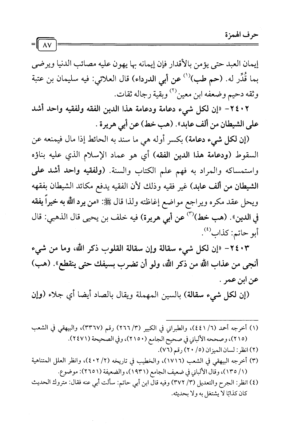2402 - "إن لكل شيء دعامة ودعامة هذا الدين الفقه ولفقيه واحد أشد على الشيطان من ألف عابد". (هب خط) عن أبي هريرة.