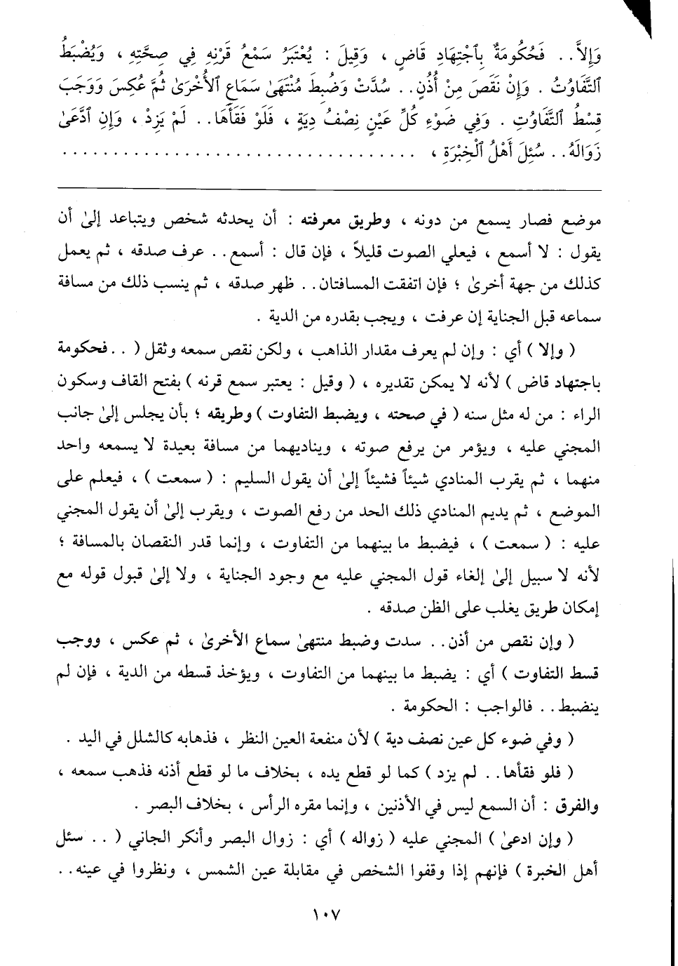 (وإلا) أي: وإن لم يعرف مقدار الذاهب، ولكن نقص سمعه وثقل ( .. فحكومة باجتهاد قاض) لأنه لا يمكن تقديره، (وقيل: يعتبر سمع قرنه) بفتح القاف وسكون الراء: من له مثل سنه (في صحته، ويضبط التفاوت) (وطريقه؛ بأن يجلس إلى جانب المجني عليه، ويؤمر من يرفع صوته، ويناديهما من مسافة بعيدة لا يسمعه واحد منهما، ثم يقرب المنادي شيئًا فشيئًا إلى أن يقولط السليم: (سمعت)، فيعلم على الموضع، ثم يديم المنادي ذلك الحد من رفع الصوت، ويقرب إلى أن يقول المجني عليه: (سمعت)، فيضبط ما بينهما من التفاوت، وإنما قدر النقصان بالمسافة؛ لأنه لا سبيل إلى إلغاء قول المجني عليه مع وجود الجناية، ولا إلى قبول قوله مع إمكان طريق يغلب على الظن صدقه.