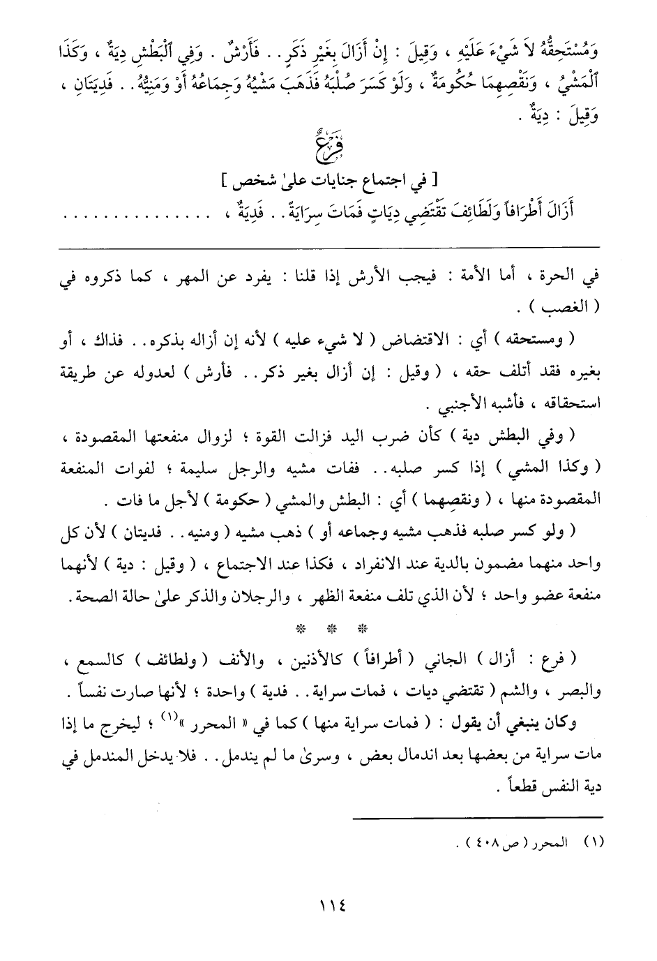 (ولو كسر صلبه فذهب مشيه وجماعه أو) ذهب مشيه (ومنيه .. فديتان) لأن كل واحد منهما مضمون بالدية عند الانفراد، فكذا عند الاجتماع، (وقيل: دية) لأنهما منفعة عضو واحد؛ لأن الذي تلف منفعة الظهر، والرجلان والذكر على حالة الصحة.