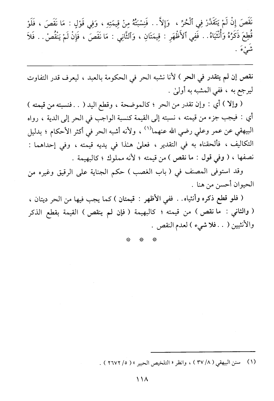 (وإلا) أي: وإن تقدر من الحر؛ كالموضحة، وقطع اليد ( .. فنسبته من قيمته) أي: فيجب جزء من قيمته، نسبته إلى القيمة كنسبة الواجب في الحر إلى الدية، رواه البيهقي عن عمر وعلي رضي الله عنهما (١)، ولأنه أشبه الحر في أكثر الأحكام؛ بدليل التكاليف، فألحقناه به في التقدير، فعلى هذا في يديه قيمته، وفي إحداهما: نصفها، (وفي قول: ما نقص) من قيمته؛ لأنه مملوك؛ كالبهيمة.