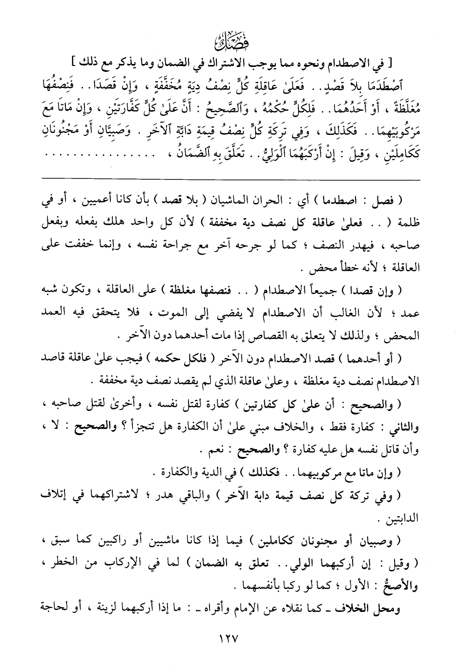 (وإن قصدا) جميعًا الاصطدام ( .. فنصفها مغلظة) على العاقلة، وتكون شبه عمد؛ لأن الغالب أن الاصطدام لا يفضي إلى الموت، فلا يتحقق فيه العمد المحض؛ ولذلك لا يتعلق به القصاص إذا مات أحدهما دون الآخر.
