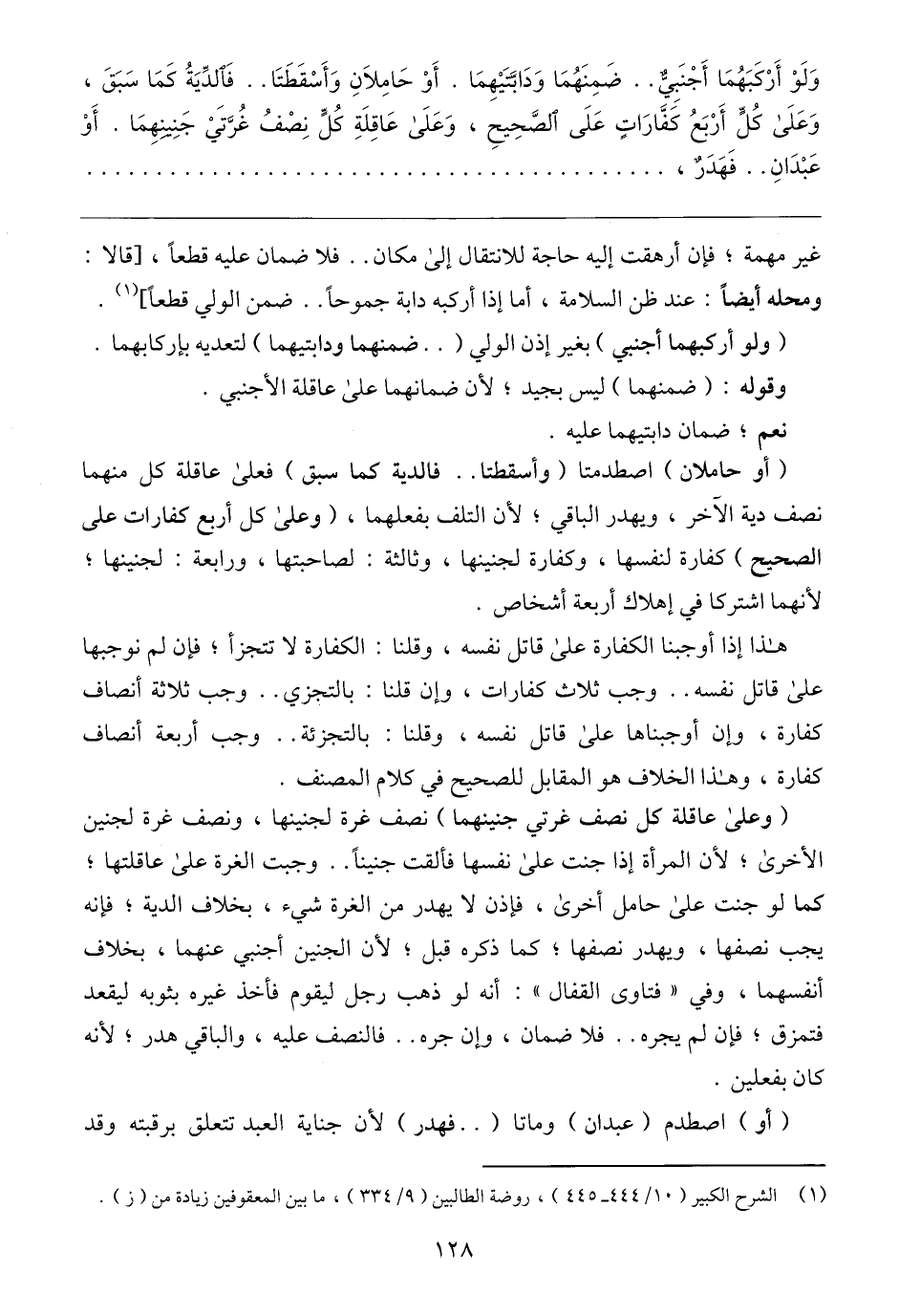 (أو حاملان) اصطدمتا (وأسقطتا .. فالدية كما سبق) فعلى عاقلة كل منهما نصف دية الآخر، ويهدر الباقي؛ لأن التلف بفعلهما، (وعلى كل أربع كفارات على الصحيح) كفارة لنفسها، وكفارة لجنينها، وثالثة: لصاحبتها، ورابعة: لجنينها؛ لأنهما اشتركا في إهلاك أربعة أشخاص.