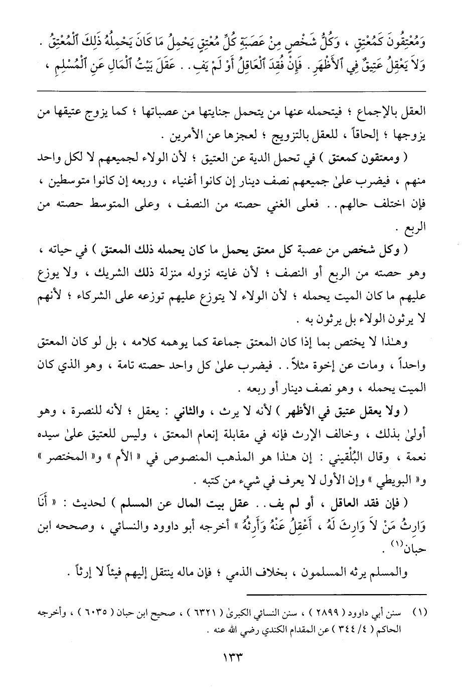 (فإن فقد العاقل، أو لم يف .. عقل بيت المال عن المسلم) لحديث: "أَنَا وَارِثُ مَنْ لَا وَارثَ لَهُ، أَعْقِلُ عَنْهُ وَأَرثُهُ" أخرجه أبو داوود والنسائي، وصححه ابن حبان (١).