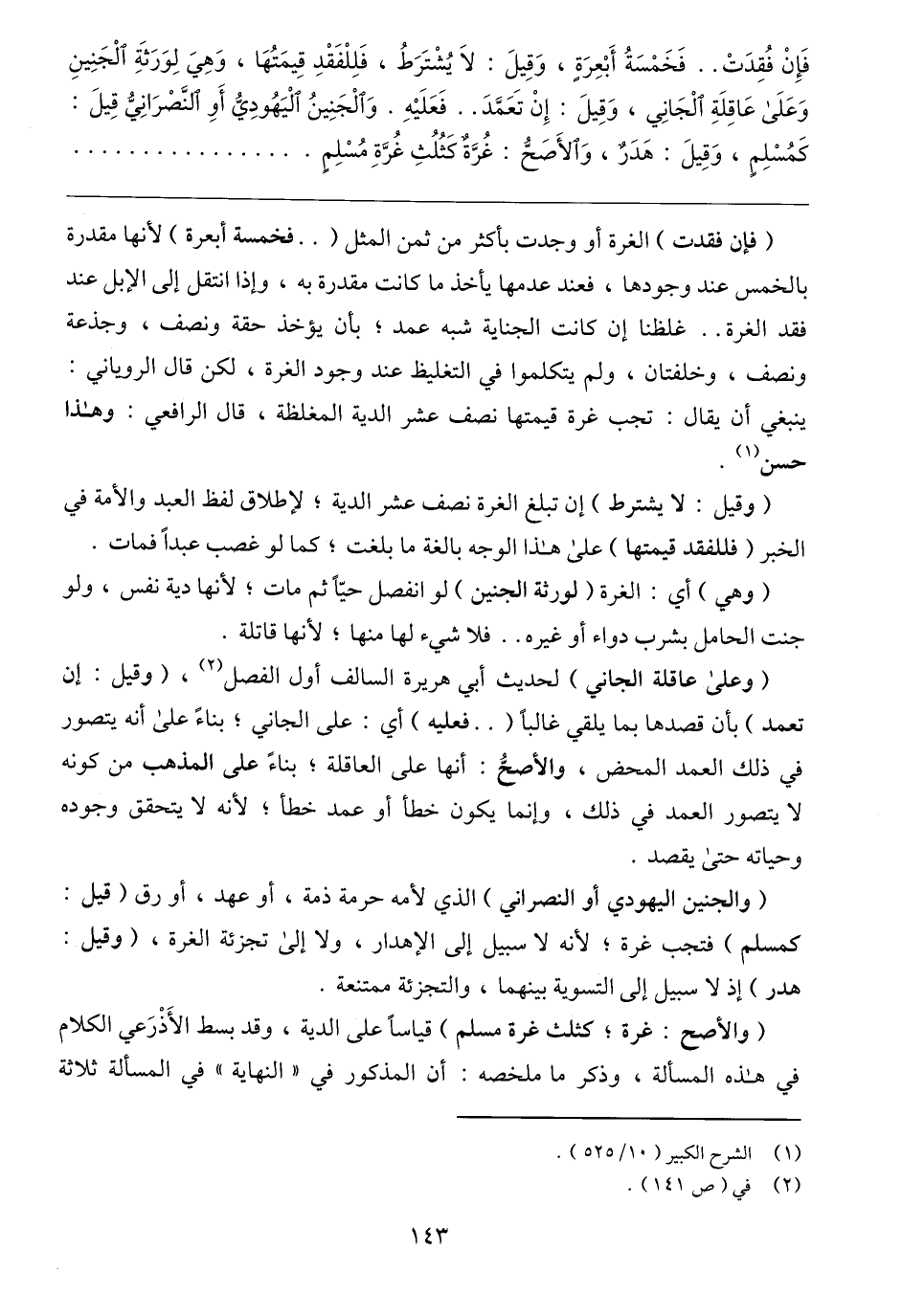 (والجنين اليهودي أو النصراني) الذي لأمه حرمة ذمة، أو عهد، أو رق (قيل: كمسلم) فتجب غرة؛ لأنه لا سبيل إلى الإهدار، ولا إلى تجزئة الغرة، (وقيل: هدر) إذ لا سبيل إلى التسوية بينهما، والتجزئة ممتنعة.