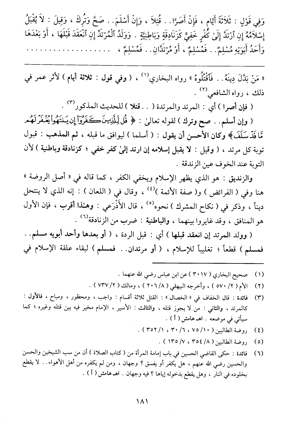 (٦) فائدة: حكى القاضي الحسين في باب إمامة المرأة من (كتاب الصلاة) أن من سب الشيخين والحسن والحسين رضي الله عنهم، هل يكفر أو يفسق؟ وجهان، ومن لم يكفره من أهل الأهواء .. لا يقطع بخلوده في النار، وهل يقطع بدخوله إياها؟ فيه وجهان. اهـ هامش (أ).