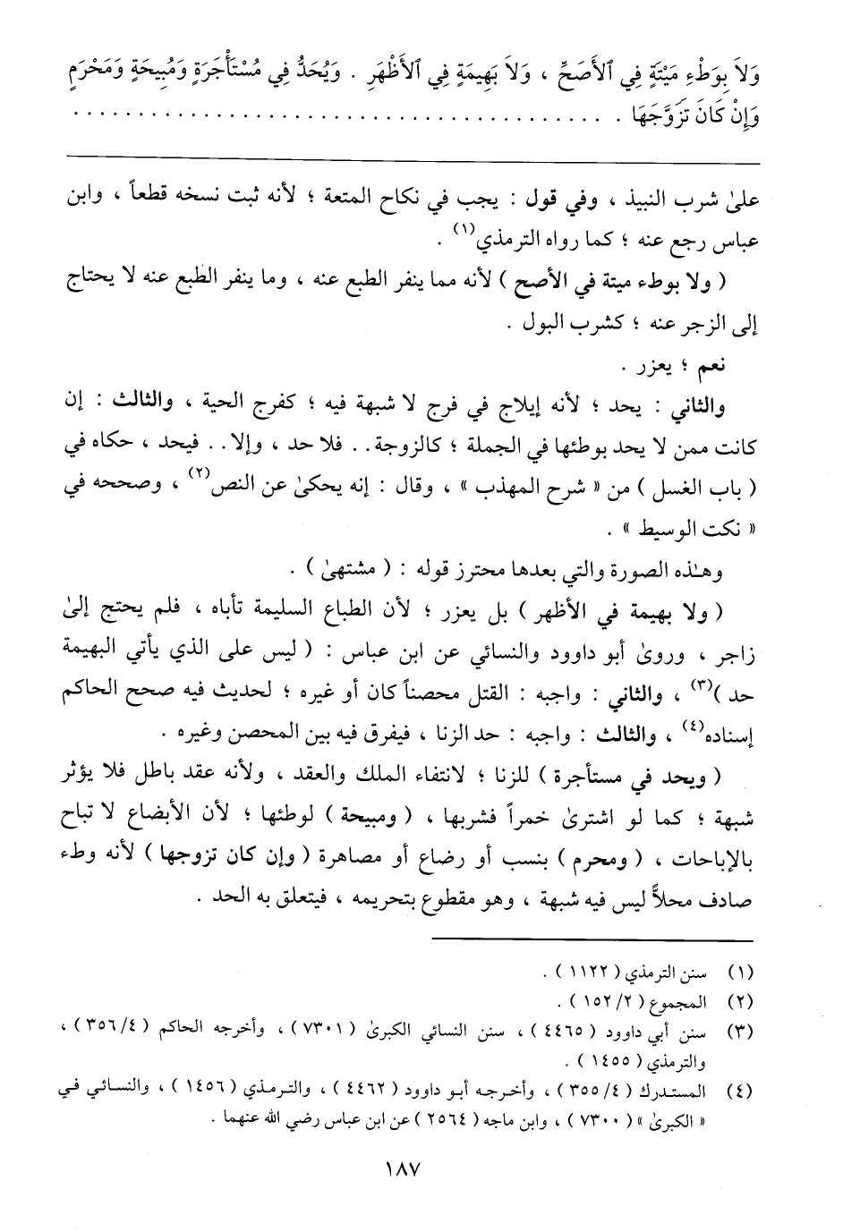 على شرب النبيذ، وفي قول: يجب في نكاح المتعة؛ لأنه ثبت نسخه قطعًا، وابن عباس رجع عنه؛ كما رواه الترمذي (١).