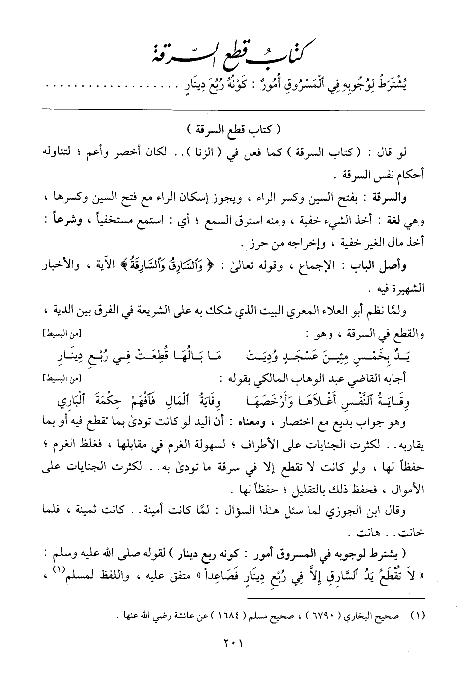 (يشترط لوجوبه في المسروق أمور: كونه ربع دينار) لقوله صلى الله عليه وسلم: "لَا تُقْطَعُ يَدُ السَّارِقِ إِلَّا فِي رُبْعِ دِينَارٍ فَصَاعِدًا" متفق عليه، واللفظ لمسلم (١)،