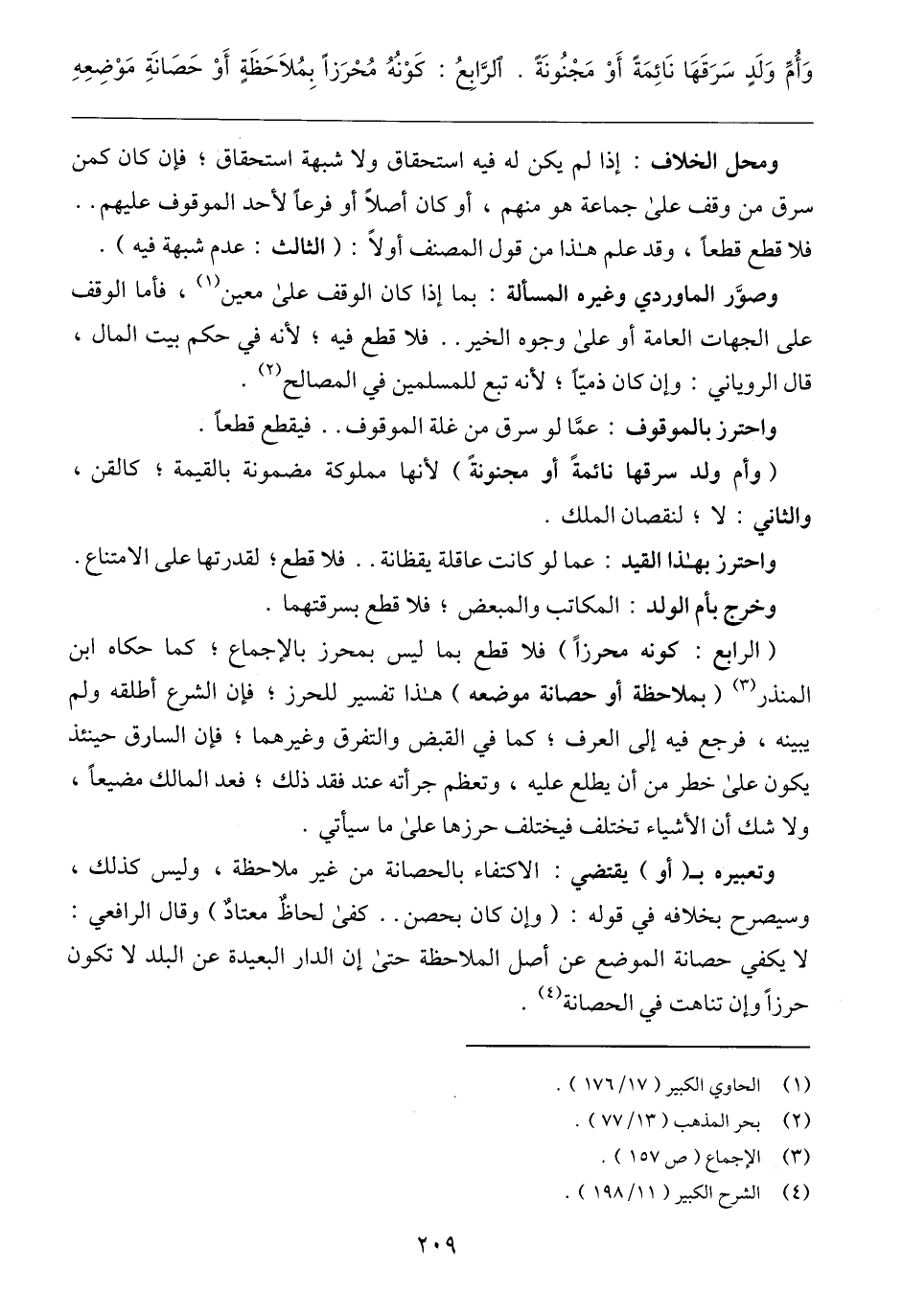 (الرابع: كونه محرزًا) فلا قطع بما ليس بمحرز بالإجماع؛ كما حكاه ابن المنذر (٣) (بملاحظة أو حصانة موضعه) هذا تفسير للحرز؛ فإن الشرع أطلقه ولم يبينه، فرجع فيه إلى العرف؛ كما في القبض والتفرق وغيرهما؛ فإن السارق حينئذ يكون على خطر من أن يطلع عليه، وتعظم جرأته عند فقد ذلك؛ فعد المالك مضيعًا، ولا شك أن الأشياء تختلف فيختلف حرزها على ما سيأتي.