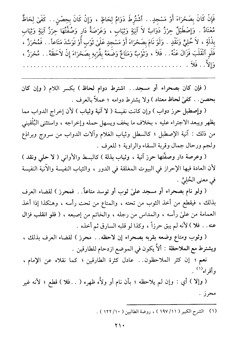 (وثوب ومتاع وضعه بقربه بصحراء إن لاحظه .. محرز) لقضاء العرف بذلك، ويشترط مع الملاحظة: ألَّا يكون في الموضع ازدحام للطارقين.