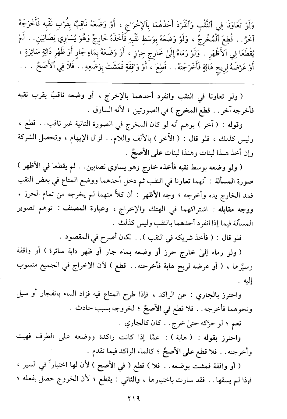 (ولو وضعه بوسط نقبه فأخذه خارج وهو يساوي نصابين .. لم يقطعا في الأظهر) صورة المسألة: أنهما تعاونا في النقب ثم دخل أحدهما ووضع المتاع في بعض النقب فمد الخارج يده وأخرجه؛ وجه الأظهر: أن كلًّا منهما لم يخرجه من تمام الحرز، ووجه مقابله: اشتراكهما في الهتك والإخراج، وعبارة المصنف: توهم تصوير المسألة فيما إذا انفرد أحدهما بالنقب وليس كذلك.