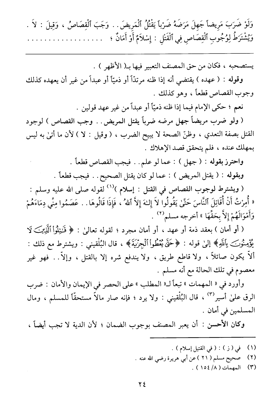 (ويشترط لوجوب القصاص في القتل: إسلام) (١) لقوله صلى الله عليه وسلم: "أُمِرْتُ أَنْ أُقَاتِلَ النَّاسَ حَتَّى يَقُولُوا لَا إِلهَ إِلَّا اللهُ، فَإِذَا قَالُوهَا. . عَصَمُوا مِنِّي دِمَاءَهُمْ وَأَمْوَالَهُمْ إِلَّا بِحَقِّهَا" أخرجه مسلم (٢).