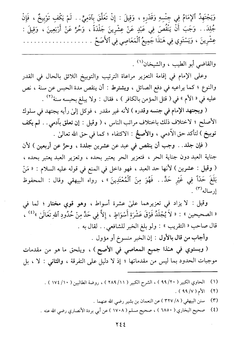 (فإن جلد. . وجب أن ينقص في عبد عن عشرين جلدة، وحرٍّ عن أربعين) لأن جناية العبد دون جناية الحر، فتعزير الحر يعتبر بحده، وتعزير العبد يعتبر بحده، (وقيل: عشرين) لأنها حد العبد، فهو داخل في المنع في قوله عليه السلام: "مَنْ بَلَغَ حَدًّا فِي غَيْرِ حَدٍّ. . فَهُوَ مِنَ الْمُعْتَدِينَ"، رواه البيهقي وقال: المحفوظ إرساله (٣).