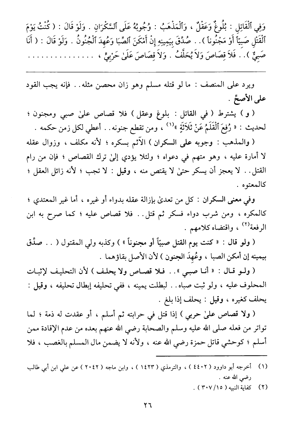 (و) يشترط (في القاتل: بلوغ وعقل) فلا قصاص على صبي ومجنون؛ لحديث: "رُفِعَ الْقَلَمُ عَنْ ثَلَاثَةٍ" (١)، ومن تقطع جنونه. . أعطي لكل زمن حكمه.