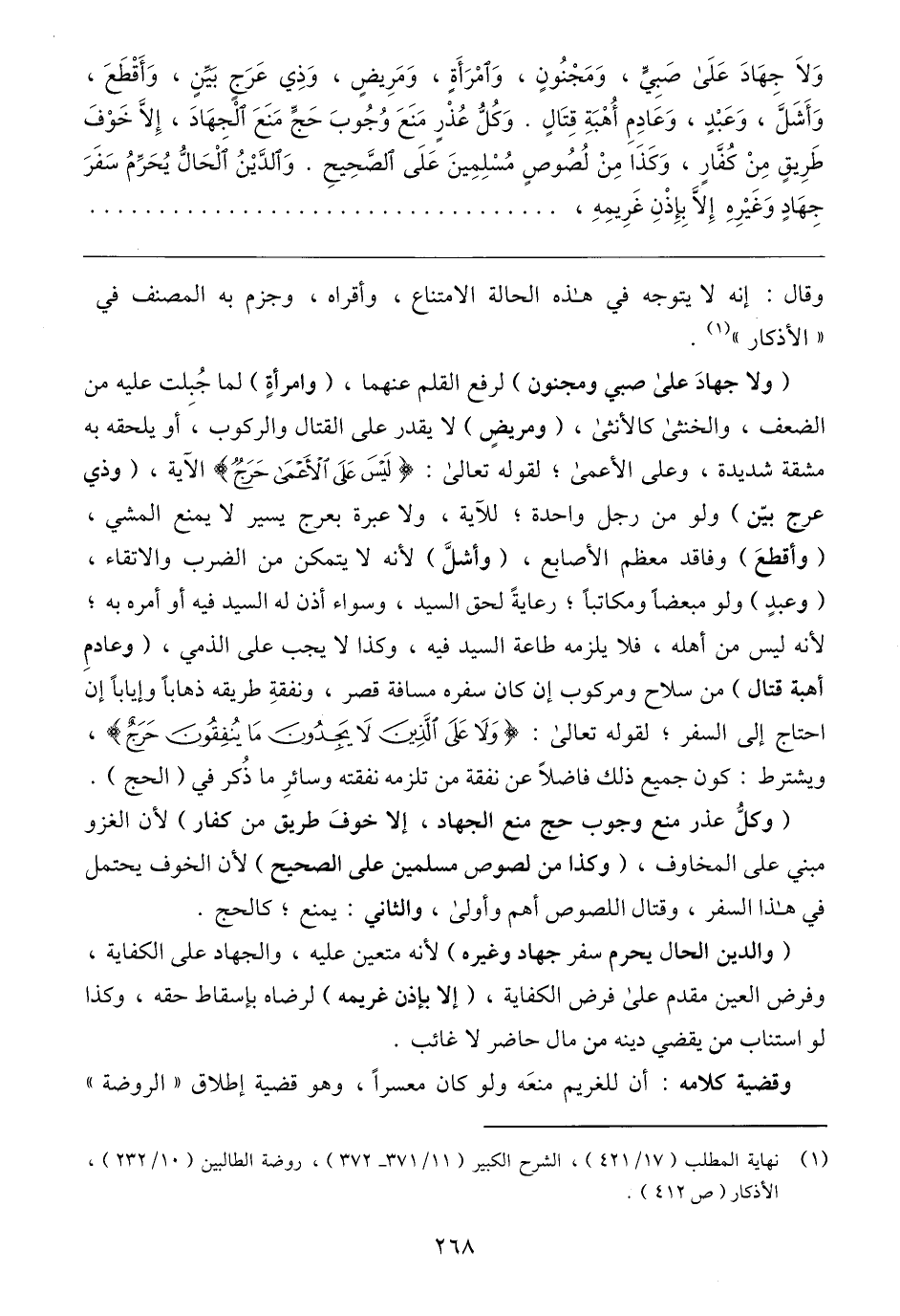 (ولا جهادَ على صبي ومجنون) لرفع القلم عنهما، (وامرأةٍ) لما جُبِلت عليه من الضعف، والخنثى كالأنثى، (ومريضٍ) لا يقدر على القتال والركوب، أو يلحقه به مشقة شديدة، وعلى الأعمى، لقوله تعالى: {لَيْسَ عَلَى الْأَعْمَى حَرَجٌ} الآية، (وذي عرج بيّن) ولو من رجل واحدة، للآية، ولا عبرة بعرج يسير لا يمنع المشي، (وأقطعَ) وفاقد معظم الأصابع، (وأشلَّ) لأنه لا يتمكن من الضرب والاتقاء، (وعبدٍ) ولو مبعضًا ومكاتبًا، رعايةً لحق السيد، وسواء أذن له السيد فيه أو أمره به؛ لأنه ليس من أهله، فلا يلزمه طاعة السيد فيه، وكذا لا يجب على الذمي، (وعادمِ أهبة قتال) من سلاح ومركوب إن كان سفره مسافة قصر، ونفقةِ طريقه ذهابًا وإيابًا إن احتاج إلى السفر؛ لقوله تعالى: {وَلَا عَلَى الَّذِينَ لَا يَجِدُونَ مَا يُنْفِقُونَ حَرَجٌ}، ويشترط: كون جميع ذلك فاضلًا عن نفقة من تلزمه نفقته وسائرِ ما ذُكر في (الحج).