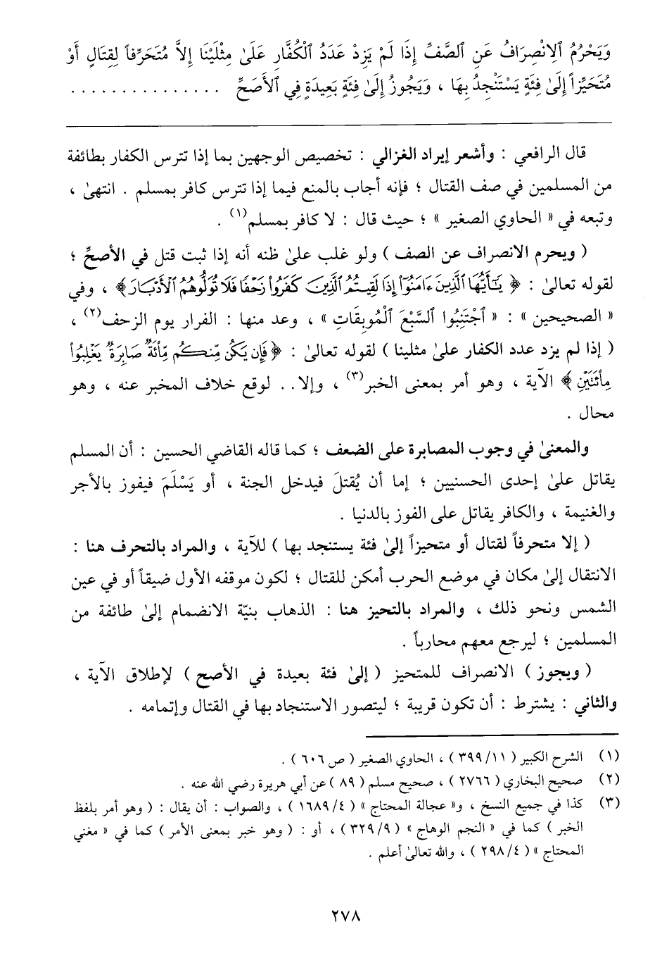 (ويحرم الانصراف عن الصف) ولو غلب على ظنه أنه إذا ثبت قتل في الأصحِّ؛ لقوله تعالى: {يَاأَيُّهَا الَّذِينَ آمَنُوا إِذَا لَقِيتُمُ الَّذِينَ كَفَرُوا زَحْفًا فَلَا تُوَلُّوهُمُ الْأَدْبَارَ}، وفي "الصحيحين": "اجْتَنِبُوا السَّبع الْمُوبِقَاتِ"، وعد منها: الفرار يوم الزحف (٢)، (إذا لم يزد عدد الكفار على مثلينا) لقوله تعالى: {فَإِنْ يَكُنْ مِنْكُمْ مِائَةٌ صَابِرَةٌ يَغْلِبُوا مِائَتَيْنِ} الآية، وهو أمر بمعنى الخبر (٣)، وإلا. . لوقع خلاف المخبر عنه، وهو محال.