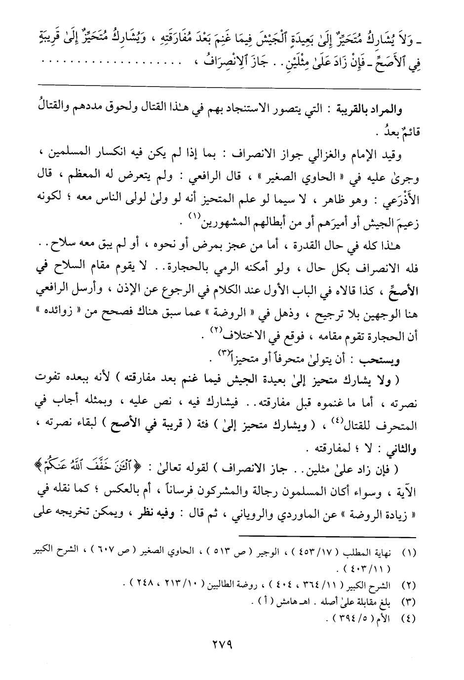 وقيد الإمام والغزالي جواز الانصراف: بما إذا لم يكن فيه انكسار المسلمين، وجرى عليه في "الحاوي الصغير"، قال الرافعي: ولم يتعرض له المعظم، قال الأَذْرَعي: وهو ظاهر، لا سيما لو علم المتحيز أنه لو ولى لولى الناس معه؛ لكونه زعيمَ الجيش أو أميرَهم أو من أبطالهم المشهورين (١).