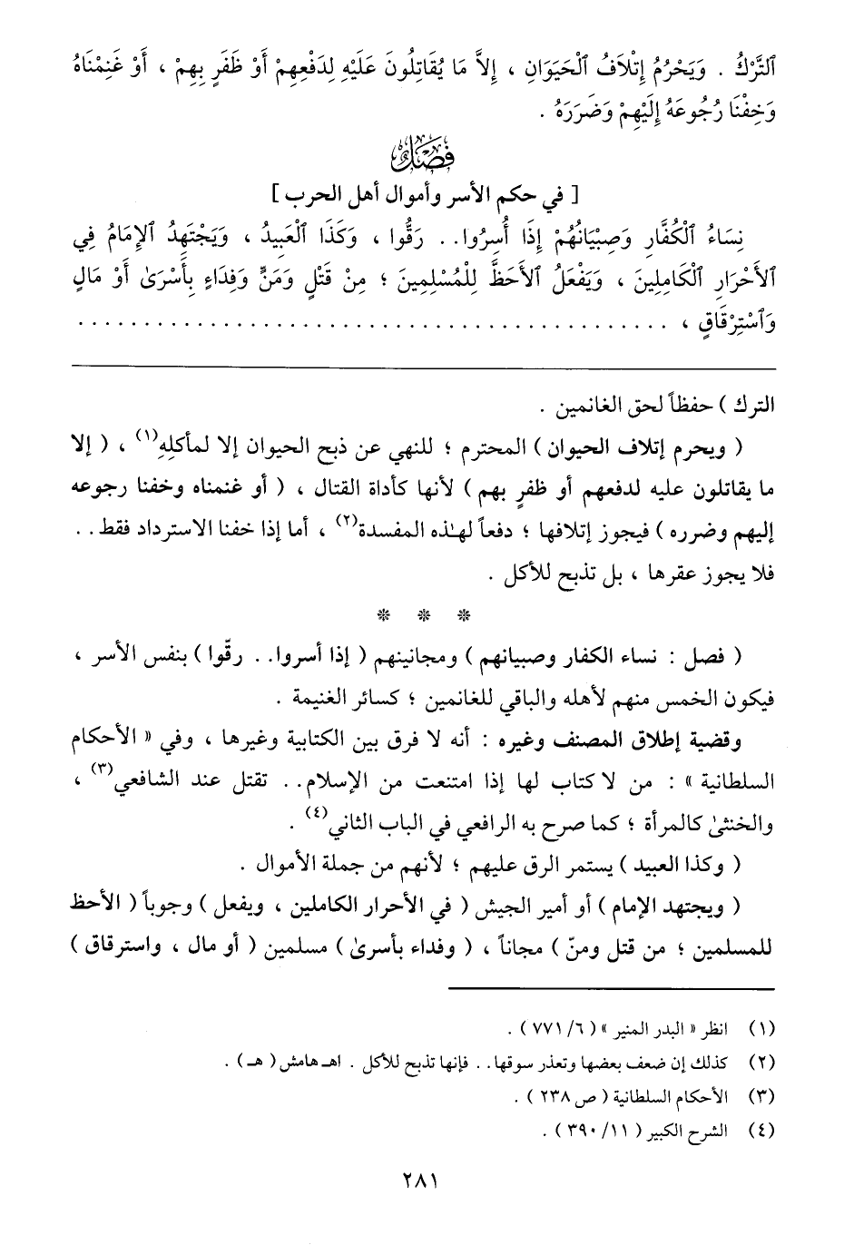 (ويحرم إتلاف الحيوان) المحترم؛ للنهي عن ذبح الحيوان إلا لمأكلِهِ (١)، (إلا ما يقاتلون عليه لدفعهم أو ظفرٍ بهم) لأنها كأداة القتال، (أو غنمناه وخفنا رجوعه إليهم وضرره) فيجوز إتلافها؛ دفعًا لهذه المفسدة (٢)، أما إذا خفنا الاسترداد فقط .. فلا يجوز عقرها، بل تذبح للأكل.
