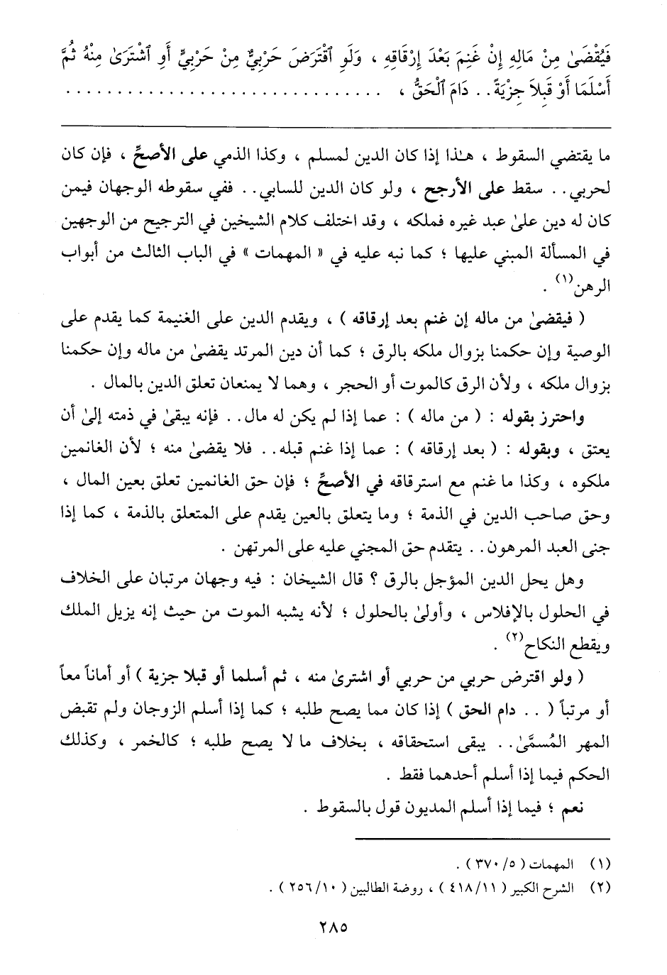 ما يقتضي السقوط، هذا إذا كان الدين لمسلم، وكذا الذمي على الأصحِّ، فإن كان لحربي .. سقط على الأرجح، ولو كان الدين للسابي .. ففي سقوطه الوجهان فيمن كان له دين على عبد غيره فملكه، وقد اختلف كلام الشيخين في الترجيح من الوجهين في المسألة المبني عليها؛ كما نبه عليه في "المهمات" في الباب الثالث من أبواب الرهن (١).